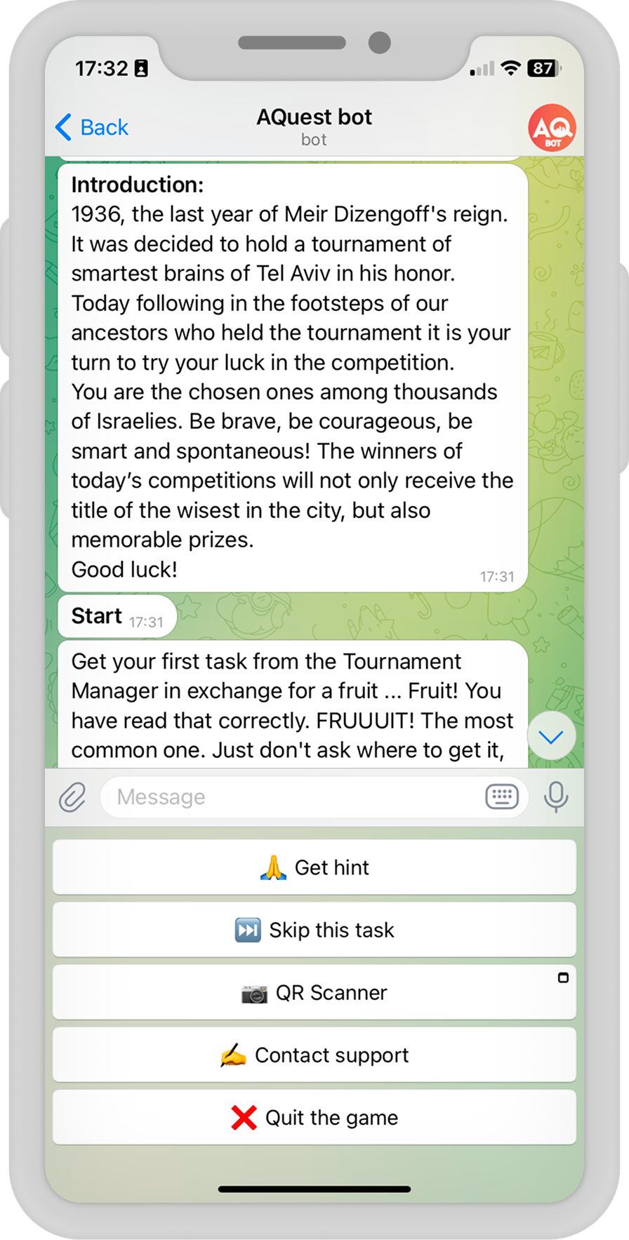 A Telegram chatbot that offers interactive location-based quests in Israeli cities. Monetized via access codes and used by both locals and tourists.р>
