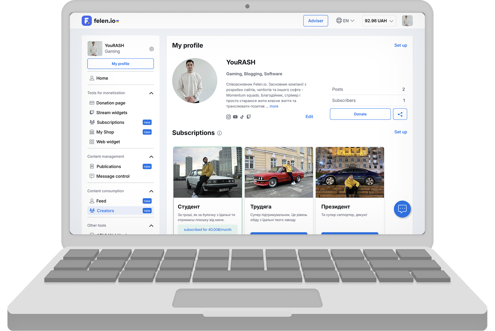 A high-load platform for content creators with subscriptions, donations, and product sales. Combines real-time WebSocket interactions with a secure crypto & fiat payment system.