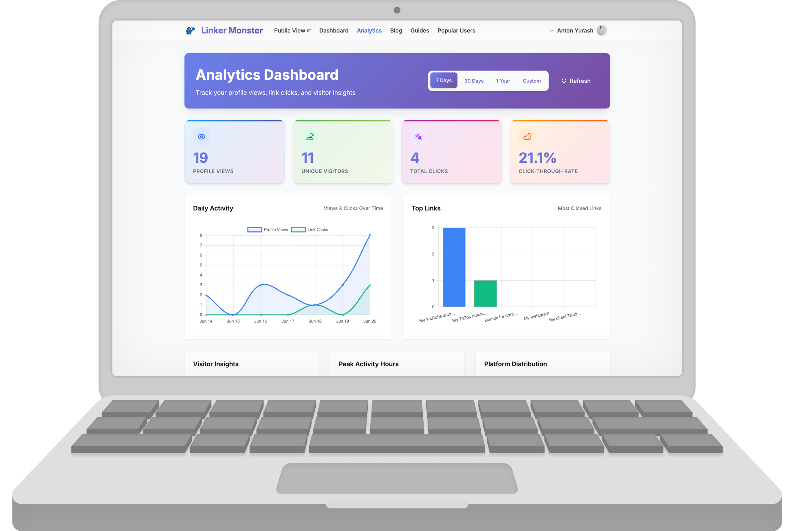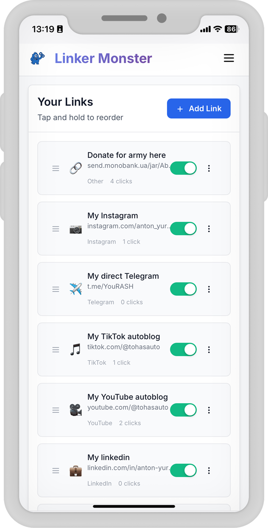 Linker Monster started as a pet project and became a compact platform for managing personal and creator-friendly link pages. Despite the limited time frame, it includes a full landing site, a smooth drag-n-drop dashboard for organizing links, an analytics panel with traffic charts and click stats, and a built-in blog with SEO-focused articles and guides.