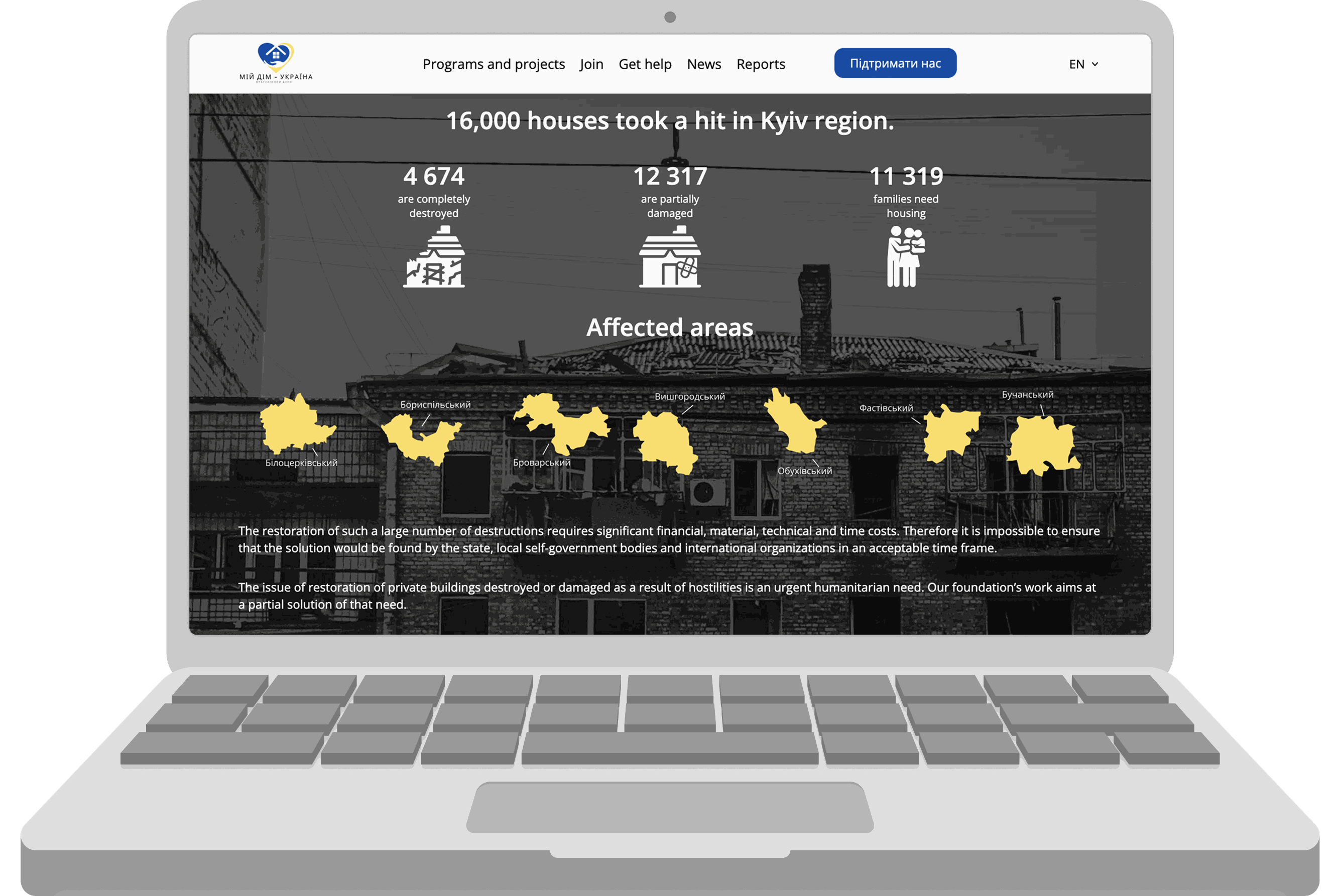 The website of the "My Home – Ukraine" charitable foundation serves as a central hub for its mission to assist residents of Kyiv region in rebuilding homes damaged or destroyed due to military aggression. The platform provides detailed information about ongoing programs, facilitates donations, and ensures transparency through regular reporting. It also offers resources for affected individuals to apply for assistance and stay informed about reconstruction efforts.