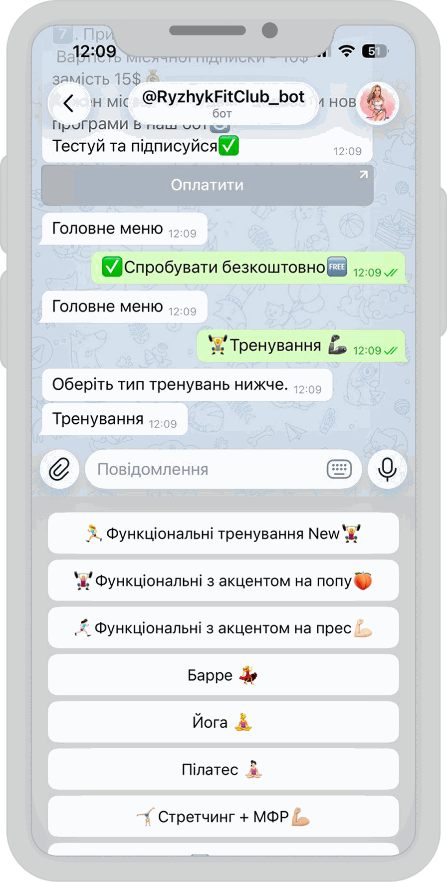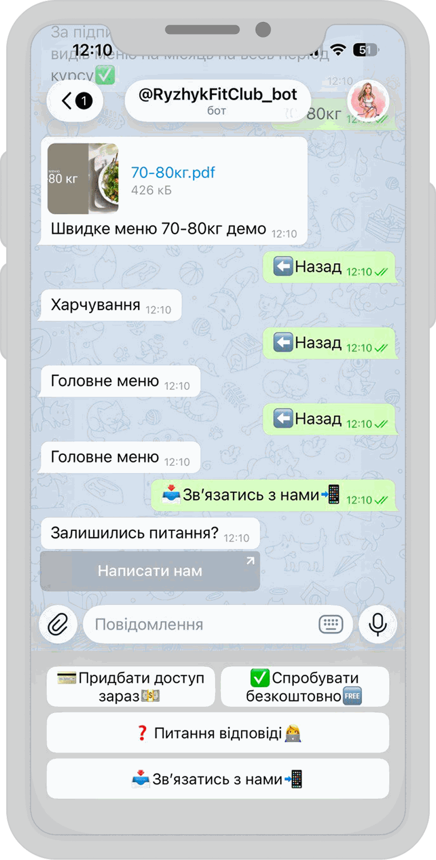 The RyzhykFitClub bot is a powerful example of how our proprietary chatbot builder can turn expert knowledge into a scalable digital product. Designed for fitness coach @ryzhyk_transformation, the bot acts as a pocket personal trainer and nutritionist. It provides users with structured workout programs across various disciplines—from yoga to high-intensity functional training—and personalized meal plans based on weight categories, all within the familiar Telegram interface.